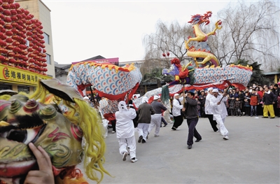 农历正月十五,市中区有着百年历史的老枣庄街龙狮队敲锣打鼓,走上街头表演。他们时而盘龙戏珠,时而跳龙穿龙尾,让广大市民大饱眼福,为节日送上了一道丰盛的民俗文化大餐。 (记者 王飞龙 摄)