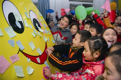 2月16日,在合肥市隆岗小学,学生们将写满新学期寄语的卡纸贴在“笑脸”上。当日,合肥市中小学校迎来开学日,各个学校以不同的方式迎接返校的学生们。
