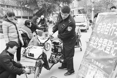 3月2日,市中区文化路派出所民警在立新社区免费为居民电动自行车打码。我市自去年11月份启动电动自行车免费实名登记工作以来,各区(市)派出所民警深入街道、社区、集市、学校等场所,统一为电动自行车上“户口”。(记者 张晶 摄)