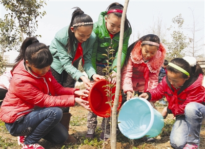 下图:植树节前夕,市中区建设路小学的同学们来到该校的教育基地参加植树活动,从小学会保护环境。 (记者 张磊 通讯员 胡安锋 摄)