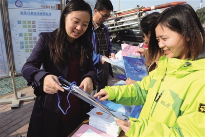 图为市气象局工作人员正在向市民发放宣传资料。 (记者 刘品 摄)