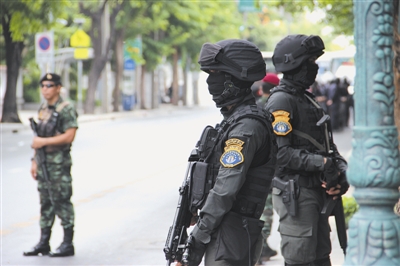 5月23日,在泰国首都曼谷,士兵在“全国维持和平秩序委员会”指定的报到地点戒备。据泰国媒体23日报道,军方发动政变后,已经宣布由陆军司令巴育暂时代理总理职务,直到军政府指定新的总理。 (新华社记者 李银泽 摄)