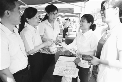 ← 5月26日,为庆祝《粮食流通管理条例》颁布实施十周年,市粮食局组织工作人员向市民发放爱粮节粮倡议书,现场讲解相关条例以及粮油食品安全常识,倡导“节约粮食 反对浪费”,受到了市民的好评。 (记者 刘品 摄)
