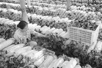 近年来,峄城区积极引导农民成立种植专业合作社,种植大棚黄背毛木耳。目前,黄背毛木耳种植面积已达210多亩,年产鲜木耳30万吨,产值660万元,1200多户农民受益。图为农民在采摘木耳。