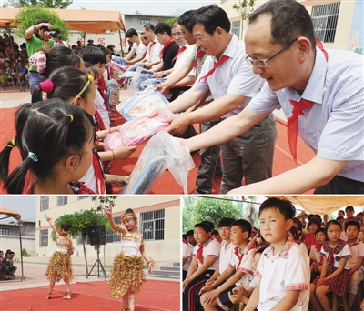 上图:赠送爱心书包。左图:精彩演出。右图:学生们聚精会神地观看文艺节目。 (本报记者 李鲁 赵宁 摄)