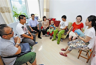 一年前,郑诗凡患上白血病,因家庭条件有限无力治疗,社会人士为小诗凡捐款17.8万元,让他成功进行了骨髓移植手术。今年5月,小诗凡返回家中,由于身体原因还不能重返校园。在媒体呼吁下,6名愿意免费为小诗凡上门教学的公益教师组建了“诗凡爱心学校”,让他得以在家中继续学业,直至康复后重返校园。图为:大家在商讨为小诗凡编排课表。 (新华社发)