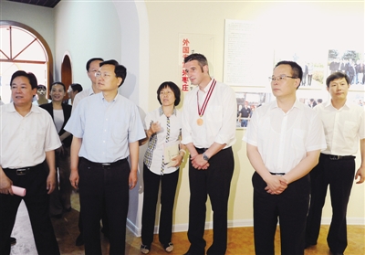 6月4日,省委常委、常务副省长孙伟(右二),市委书记、市人大常委会主任陈伟(前左二),陪同德国太阳山葡萄酒庄总经理马克·林顿先生(右三)参观汉诺故事馆。 (记者 刘品 摄)
