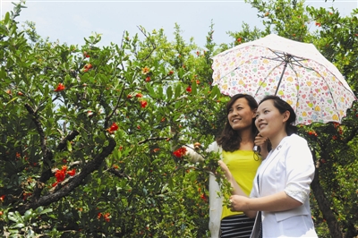 受今春持续低温的影响,峄城区冠世榴园石榴花盛开比往年推迟了一周。目前,石榴园内榴花争奇斗艳,香气四溢,游人穿行其间,犹如进入世外榴源,令其流连忘返。图为游客在石榴园内欣赏石榴花。 (孙启路 摄)