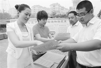 6月14日是我国第九个文化遗产日,今年文化遗产日的主题为“让文化遗产活起来”。当日,市文物局在光明广场设置展板展出我市文物保护相关情况,工作人员向市民发放文物普查宣传资料,并现场解答市民的问题,使市民认识到保护文物资源的重要性并积极参与进来。 (记者 刘品 摄)