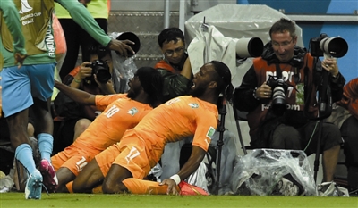 6月14日,科特迪瓦队球员热尔维尼奥(左)进球后与队友德罗巴共同庆祝。当日,在2014年巴西世界杯小组赛C组比赛中,科特迪瓦队以2比1战胜日本队。(新华社发)