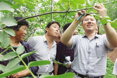 6月16日,果树技术员刘亚(右一)在凫城镇千佛崖村向核桃种植户讲解嫁接技术。当日,山亭区凫城镇开展了农业科技培训活动,发放科技书和“明白纸”1000余份,并现场讲解了核桃、樱桃、草莓的管理技术,吸引500余名村民参加。(王启蒙 摄)