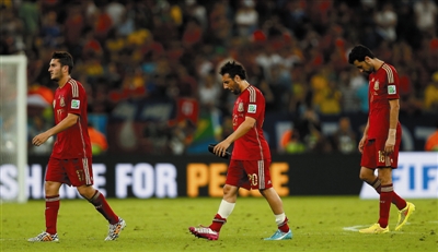 6月18日,在巴西里约热内卢马拉卡纳大球场进行的2014年巴西世界杯小组赛B组比赛中,西班牙队以0比2负于智利队。卫冕冠军西班牙队以两战皆败,提前出局。