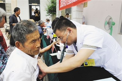 6月27日,枣庄矿业集团总医院组织近20名医疗专家,到山亭区北庄镇小西庄村开展义诊活动。一天时间,专家们免费为200余名党员和群众做了心电图、彩超等项目检查,接受咨询500多人次,并发放了健康宣传手册。图为义诊现场。 (记者 赵宁 通讯员 张颖 摄)