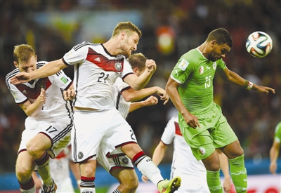 当日,在2014年巴西世界杯八分之一决赛中,德国队2比1战胜阿尔及利亚队。