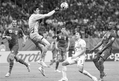 7月1日,比利时队守门员蒂·库尔图瓦(左二)门前出击。当日,在2014年巴西世界杯八分之一决赛中,比利时队2比1战胜美国队。
