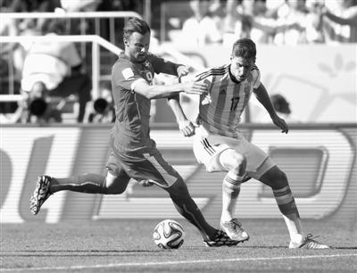 7月1日,瑞士队球员约·德尔米奇(右)在比赛中拼抢。当日,在2014年巴西世界杯八分之一决赛中,阿根廷队1比0战胜瑞士队。(新华社发)