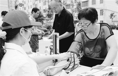 连日来,台儿庄区卫生系统开展了“仁心为民千医义诊”活动。组织50余名党员志愿者深入社区和农村为群众义诊,并讲解夏季常见病、多发病的预防知识。图为,7月2日,党员志愿者在西苑小区为居民测量血压。 (张严新 朱伟 摄)