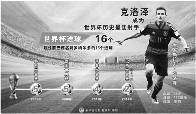 德国队前锋克洛泽在半决赛的进球,是他个人在世界杯的第16粒进球,创造了个人总进球数的新纪录。