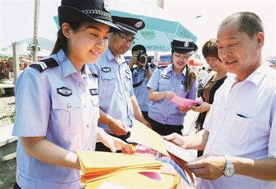 7月9日,民警在孟庄镇大集向村民讲解法律知识。连日来,市中公安分局在人流量较多的农贸集会上开展法制宣传活动,向村民发放法制宣传手册,普及法律知识,引导村民增强法制意识。 (记者 刘品 摄)