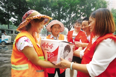 7月23日,当日大暑,持续高温,枣庄市义工联盟滕州分会的义工把环卫工人时刻挂在心上,义工在会长王春元的带领下,购买了矿泉水到滕州市荆河西路、垃圾中转站看望高温下的环卫工人,为环卫工人送去了清凉,受到了市民和环卫工人的称赞。 (记者 侯志龙 摄)