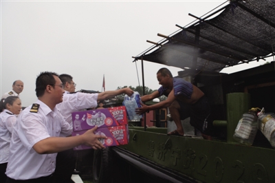 6月份以来,我市及周边地区持续干旱,京杭运河枣庄段航道水位急剧下降,大量船舶滞留。市港航管理局积极开展滞留船舶关爱活动,在沿线设立关爱救助点、应急供水点,为滞留船民群众提供饮用水、应急食品和卫生防疫药品,同时开通12395应急救助专线,24小时为船民群众提供应急救助服务。图为7月24日下午,港航职工冒雨为船民送去矿泉水和方便面。 (王燕 摄)