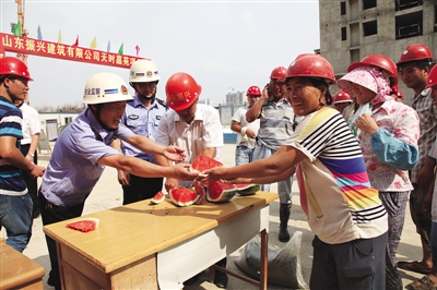 7月22日,在天时嘉苑项目施工现场,建筑工人正在吃西瓜消暑。入夏以来,滕州市建工局开展施工一线“送清凉、保健康、关注安全、促进和谐”活动,赢得广大建筑工人的交口赞誉。