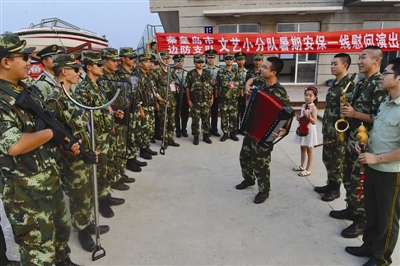 7月31日,河北省秦皇岛市公安边防支队举行以“八一军旗红”为主题的联欢会,并安排文艺小分队深入到执勤一线为基层官兵表演文艺节目,迎接“八一”建军节。 (新华社发)