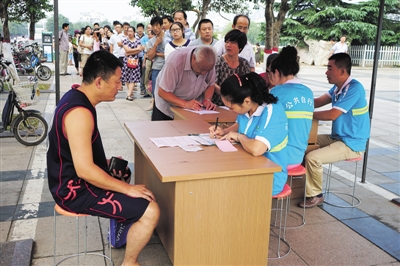 近日,记者从滕州公共自行车管理处了解到,公共自行车运行以来,受到滕州市民的热烈欢迎,龙泉广场公共自行车办卡点每天办卡约200张,日办理公共自行车卡达到800余张。图为早上在龙泉广场排队办卡的市民,正在有序办理公共自行车卡。 (特约记者 郭潇繁 摄)