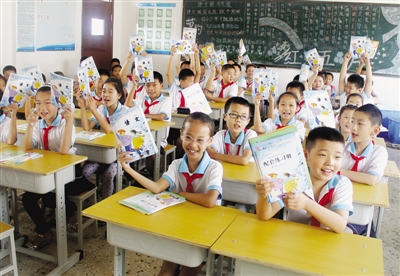 ➝9月1日,全市中小学生结束为期近两个月的多彩暑期生活,陆续开学,开始了紧张有序的学习。图为枣庄二十九中学附小四年级一班的学生们领到新书后,满脸喜悦。 (徐子棋 江耕 摄)