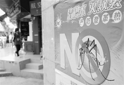 图为:广州市海珠区江南中街道紫丹大街张贴着防控登革热疫情的宣传品(10月9日摄)。