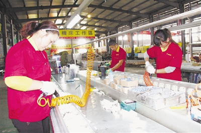 今年以来,我市突出优化营商环境,鼓励引导企业不断增加研发投入,提高创新能力,进一步推进全市产业结构调整和转型升级。图为10月9日在枣庄经济开发区,山东洪海集团的员工正在组装出口土库曼斯坦的科技创新产品“多面翻户外广告机”。 (张冬磊 摄)