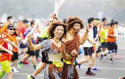 10月19日,两名打扮成“疯狂原始人”的“北马”参与者在人群中十分醒目。当日,2014年北京马拉松赛开跑,一些长跑爱好者的个性服饰成为比赛中独特的风景。 (新华社发)