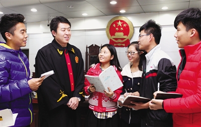 11月27日,法官在庭审结束后与大学生们进行互动交流。当日,枣庄学院部分大学生走进市中区人民法院刑事审判庭,旁听一起案件的审理过程,并与法官进行互动交流,接受法治教育,学习宪法知识,感悟宪法精神。 (吉喆 摄)