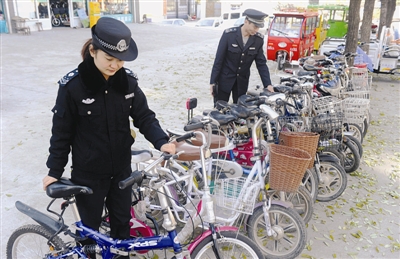 图为区城管工作人员在城区学校门口整理乱停乱放的自行车。 (孙启路 摄)