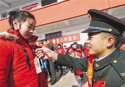 ↑ 12月2日,济南军区某部队20名即将退伍返乡的老兵来到山亭区店子镇姚营小学,将自己用津贴购买的20套棉衣赠送给贫困儿童,以献爱心的方式告别第二故乡。