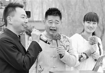 11月28日,在台儿庄区运河湿地公园,主持人肖东坡(中)与现场的男女嘉宾进行交流。当日,央视第七套《乡约》栏目摄制组走进台儿庄录制节目。此次节目讲述了台儿庄古城导游任思年寻找爱情的故事。 (张严新 摄)