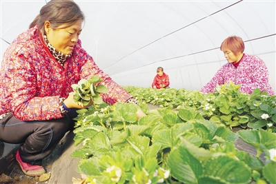 大雪时节,山亭区西集镇华臣大棚草莓种植基地,菜农正忙着摘除草莓劣质叶片、给大棚盖毛毯保温,确保草莓正常生长,来年有个好收成。 (赵连友 摄)