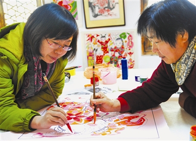 12月9日,来自潍坊市临朐县的民俗艺人在月亮湾景区内手绘年画《烙煎饼》。为丰富旅游景区的文化内涵,山亭区邀请临朐县民俗艺人到月亮湾景区创作了一批具有鲁南民俗风情的手绘年画。这些主题鲜明、用色热烈的年画将在景区内展出。 (李宗宪 满新强 摄)