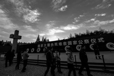 ↑12月14日,观众在侵华日军南京大屠杀遇难同胞纪念馆国家公祭仪式会场参观。首个南京大屠杀死难者国家公祭日后,侵华日军南京大屠杀遇难同胞纪念馆14日重新对外开放。据馆方统计,当日参观人数达到10.35万人次,创历史新高。该馆2014年以来的参观总人次已达734万。