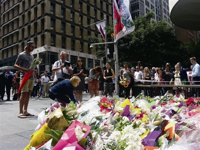 12月16日,在澳大利亚悉尼,人们在发生人质劫持事件的咖啡店前献花,悼念遇难者。澳大利亚警察16日凌晨冲入悉尼马丁广场发生人质劫持事件的咖啡馆,与劫持者交火。警方随后宣布“行动结束”,持续近17小时的人质事件告一段落。此次人质事件共造成包括劫持者在内的3人死亡、4人受伤。