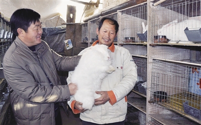 12月16日,徐庄镇计生干部(左)向红石嘴村村民褚衍兵讲解长毛兔冬季养殖管理技术。近年来,山亭区徐庄镇计生办积极引导、帮助500多户困难计生户从事特色养殖,辐射带动2000多计生家庭通过饲养长毛兔、波尔山羊等走上了致富路。 (王雷 摄)