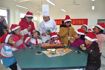 12月24日,圣诞节前夕,滕州市优滋味西点房的工作人员准备了价值3000多元的糕点,去看望界河镇中心小学留守儿童。为200余名学生送去了泡芙、红豆千层酥、巧克力麦芬蛋糕等甜点。