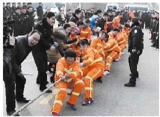 日前,滕州市城市管理局在滕州奥体中心五环广场举办了迎新年体育竞技活动,在拔河、越野长跑、象棋、兵兵球等多个项目的角逐中,千余名城管执法人员和环卫工人在充满欢乐和竞争的氛围中迎接2015年的到来。(特约记者 金亮 摄)