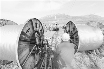 2014年12月25日,在沙沟镇邵楼220千伏输变电工程施工现场,承建该工程的枣庄力源送变电工程有限公司正在进行铁塔放线工作。该工程是枣庄供电公司为支持新城南部地区经济发展而建设的又一电力工程。 (王飞龙 王鹏 摄)