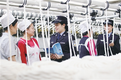 ←1月6日,民警在纺织企业车间内向职工讲解安全知识和防踩踏自救技能。连日来,市中公安分局组织民警走进劳动密集型企业宣传安全常识,提高广大职工防御能力和自救技能。 (吉喆 徐新艳 摄)