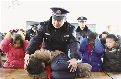 1月6日,台儿庄公安分局泥沟派出所民警到兰城小学开展“防踩踏安全教育进校园”活动,通过防踩踏安全课、踩踏逃生模拟演练等形式对小学生进行安全教育,帮助他们掌握自我保护常识。 (刘凤琦 王潇涵 摄)