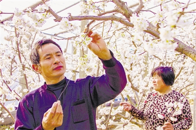 1月9日,山亭区水泉镇郑庄村果农在大棚内为樱桃花人工授粉。时值三九,天寒地冻。水泉镇果树大棚里春意盎然,洁白的樱桃花次第绽放,农民们纷纷忙碌着进行人工授粉,争取新年有个好收成。水泉镇是大棚樱桃种植专业镇,目前共建起日光樱桃大棚5000余个,年产值1.6亿元。 (刘明祥 崔琳琳 摄)