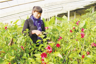 正值隆冬,而在峄城区底阁镇河湾村的温室大棚内却春意盎然,花农正为花开正艳的扶桑修剪枝叶。近年来,该村集中力量开展土地流转,积极发展特色农业,现在全村反季蔬菜、花卉苗木已达600多亩。(王思笑 赵启岭 摄)