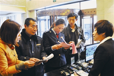 →为遏制节日腐败,严防“四风”反弹,市中区纪委成立检查组,对该区各大超市、酒店等购物卡采购、变相公款消费等情况进行明察暗访,始终保持纠正“四风”的高压态势。图为检查人员在酒店进行检查。 (巩存忠 张聪 张毅 摄)