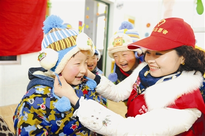 1月20日,在安徽省滁州市南谯区章广村,志愿者在给留守儿童戴上新帽子。当日是大寒节气,安徽省滁州团市委在全市范围内开展“大手牵小手,关爱留守儿童”温暖冬日活动,青年志愿者将购买的御寒围巾、手套、暖手宝等爱心物品送给留守儿童,为他们送去温暖和关爱。 (新华社发)